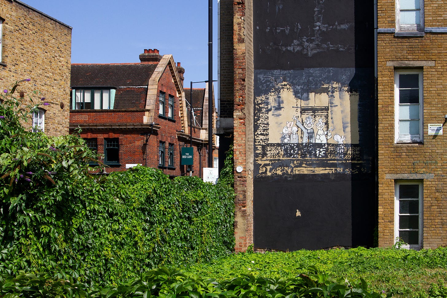 Mi piace particolarmente perché riprende un murale a cui sono molto affezionata, che si trova in una delle mie zone preferite di Londra, Stoke Newington. Realizzato nel 2003, il murale raffigura in modo ironico la famiglia reale che saluta da un balcone. L’opera occupava l’intera facciata laterale di una casa e simulava le decorazioni ornate di un palazzo reale. Il contrasto tra questa scenografia grandiosa e il contesto urbano quotidiano rendeva il lavoro ancora più efficace e ironico.